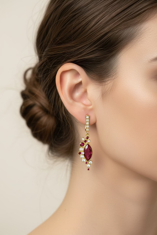 Silver earrings with red circuses.